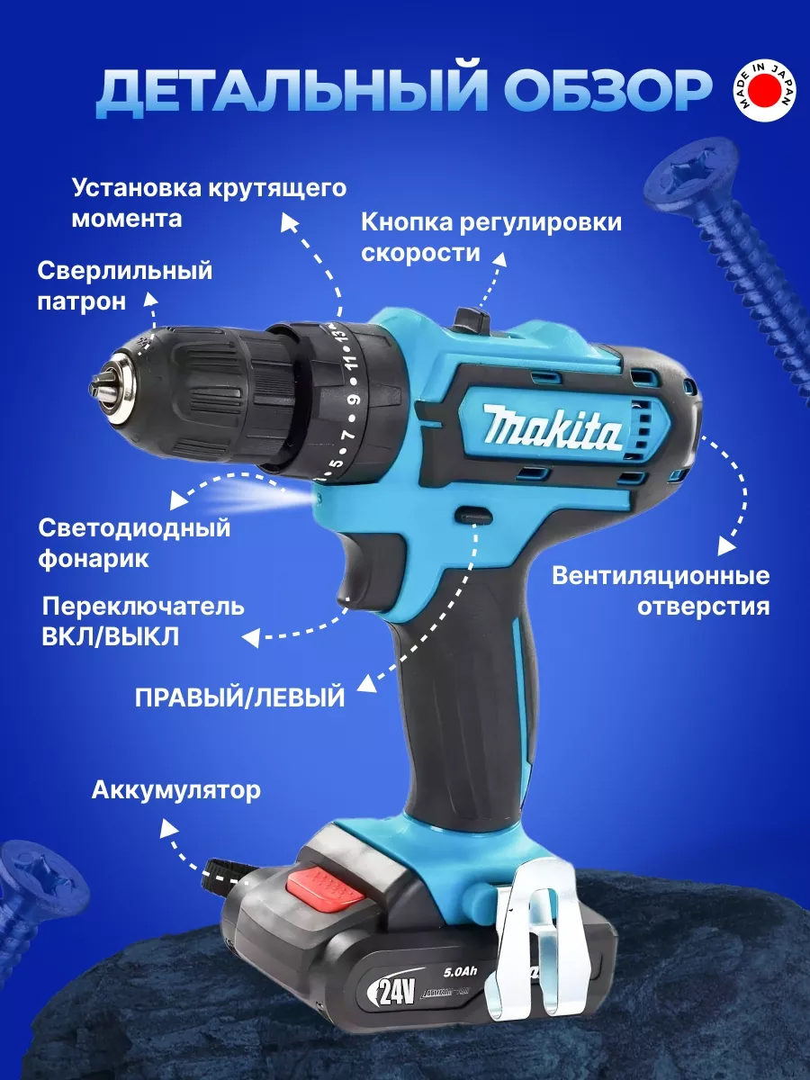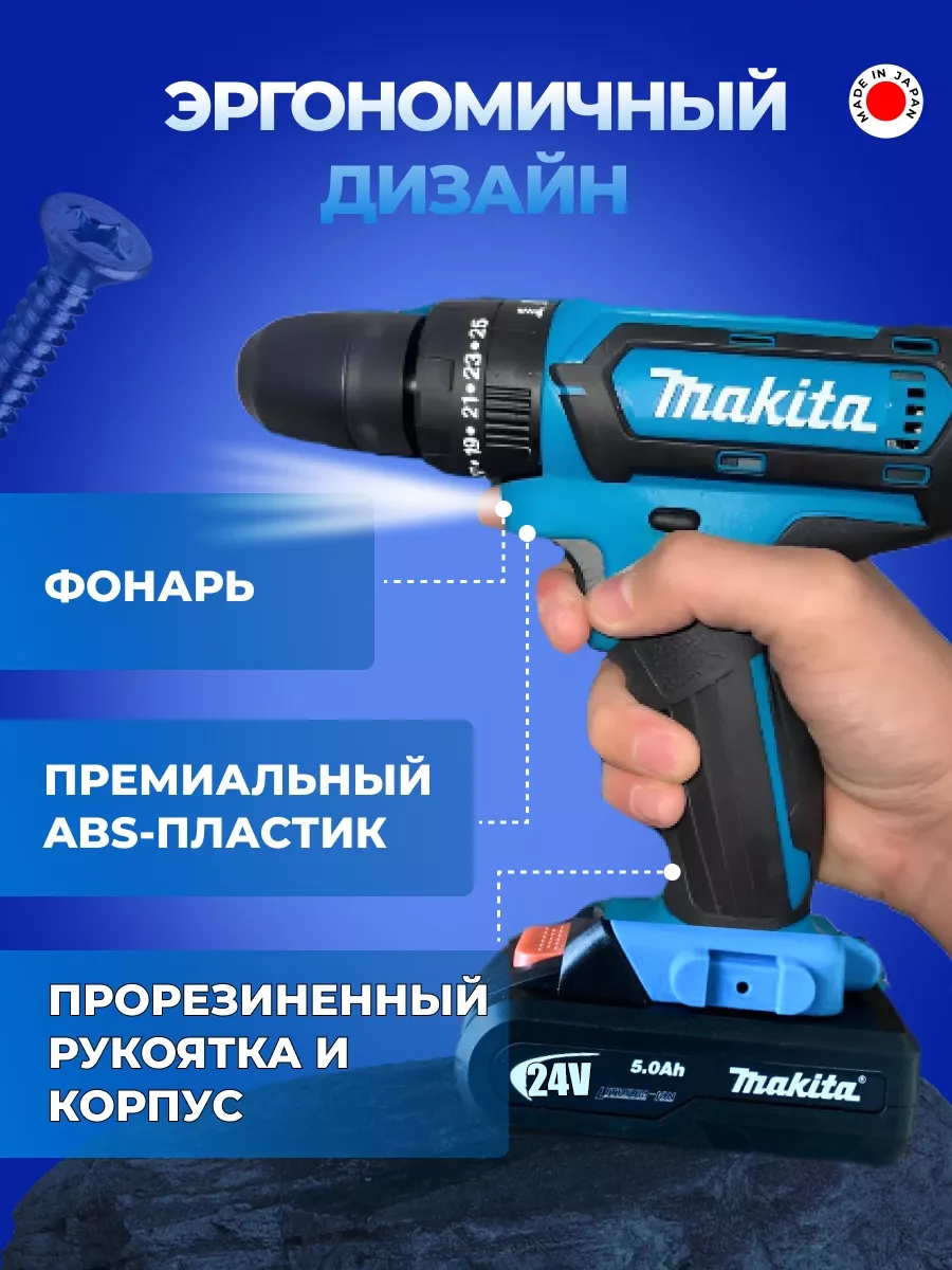 Аккумуляторный шуруповерт Makita — это идеальный выбор для тех, кто ценит качество и надежность в работе. С мощным 24V Li-ion аккумулятором на 5.0 А/ч, этот инструмент обеспечит вам долгую и эффективную работу без необходимости постоянной подзарядки.
